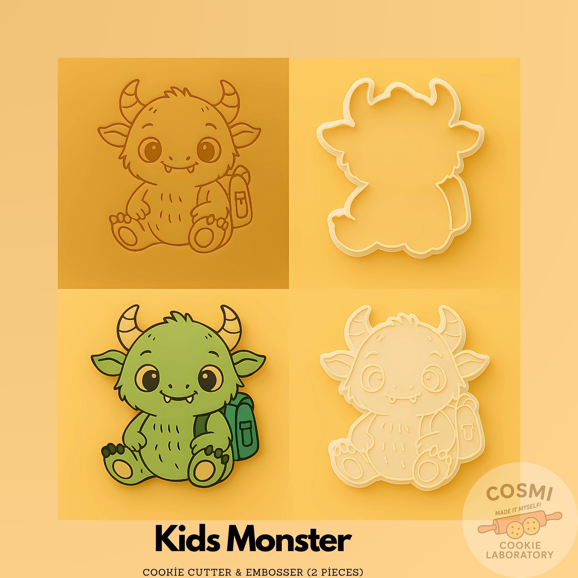 âď¸ The cutter creates a crisp monster silhouette; the embosser adds eyes, horns and backpack details for a professional finish.