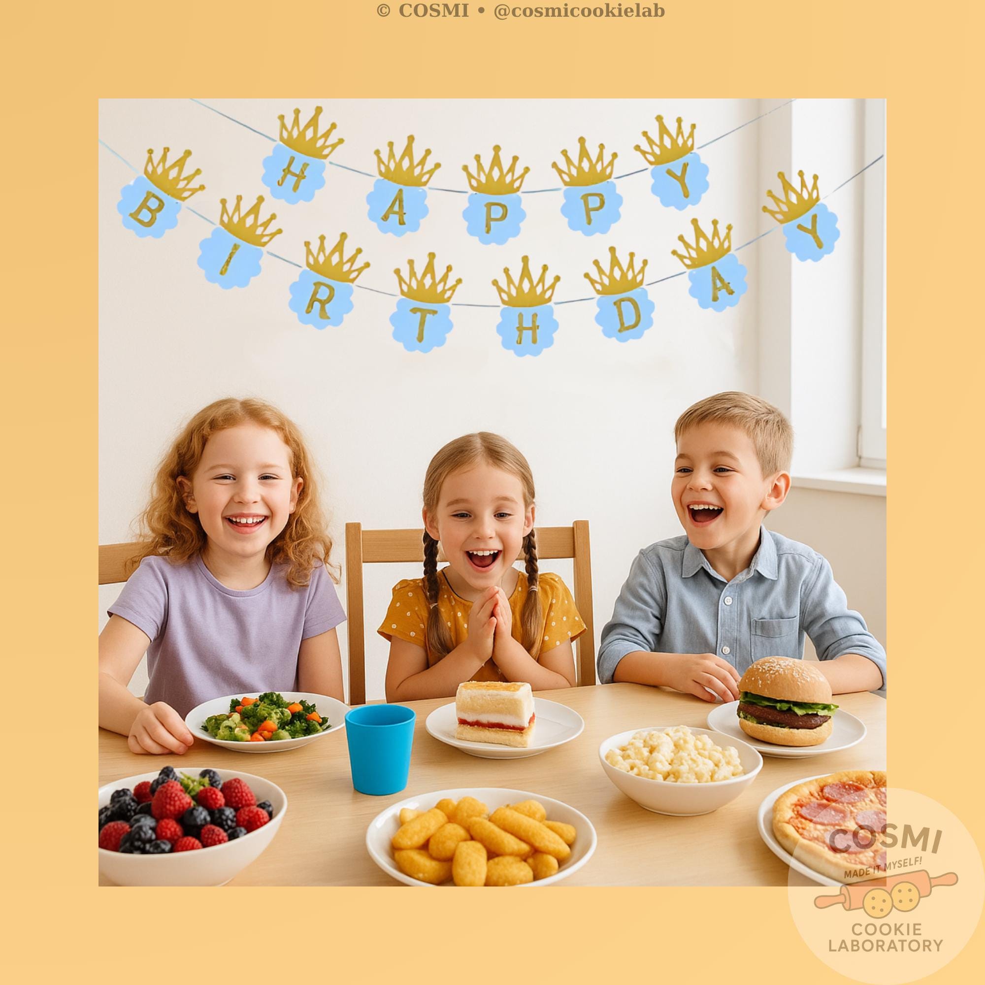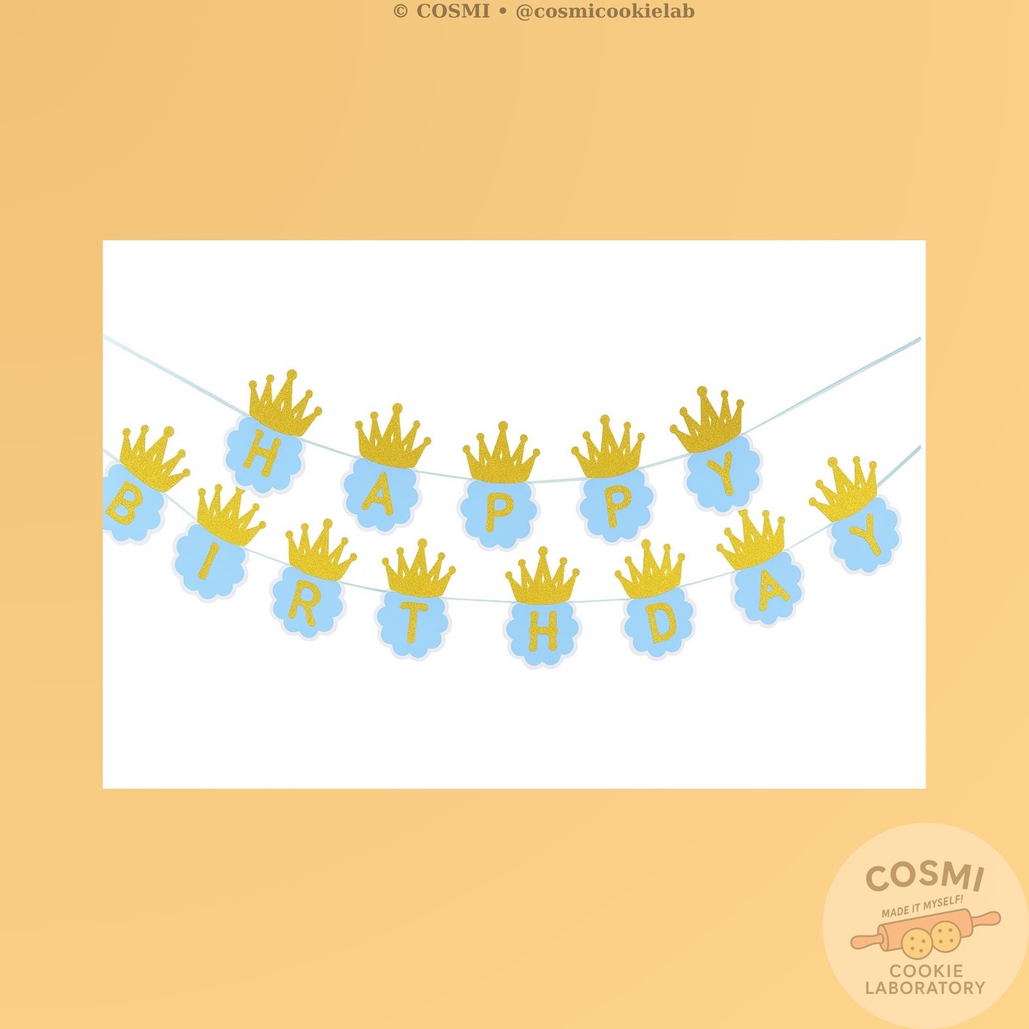 Make your little prince’s birthday extra special with this charming blue and gold “Happy Birthday” banner! Each letter is set on a cloud-shaped blue card and topped with a glittery gold crown for a royal celebration touch.