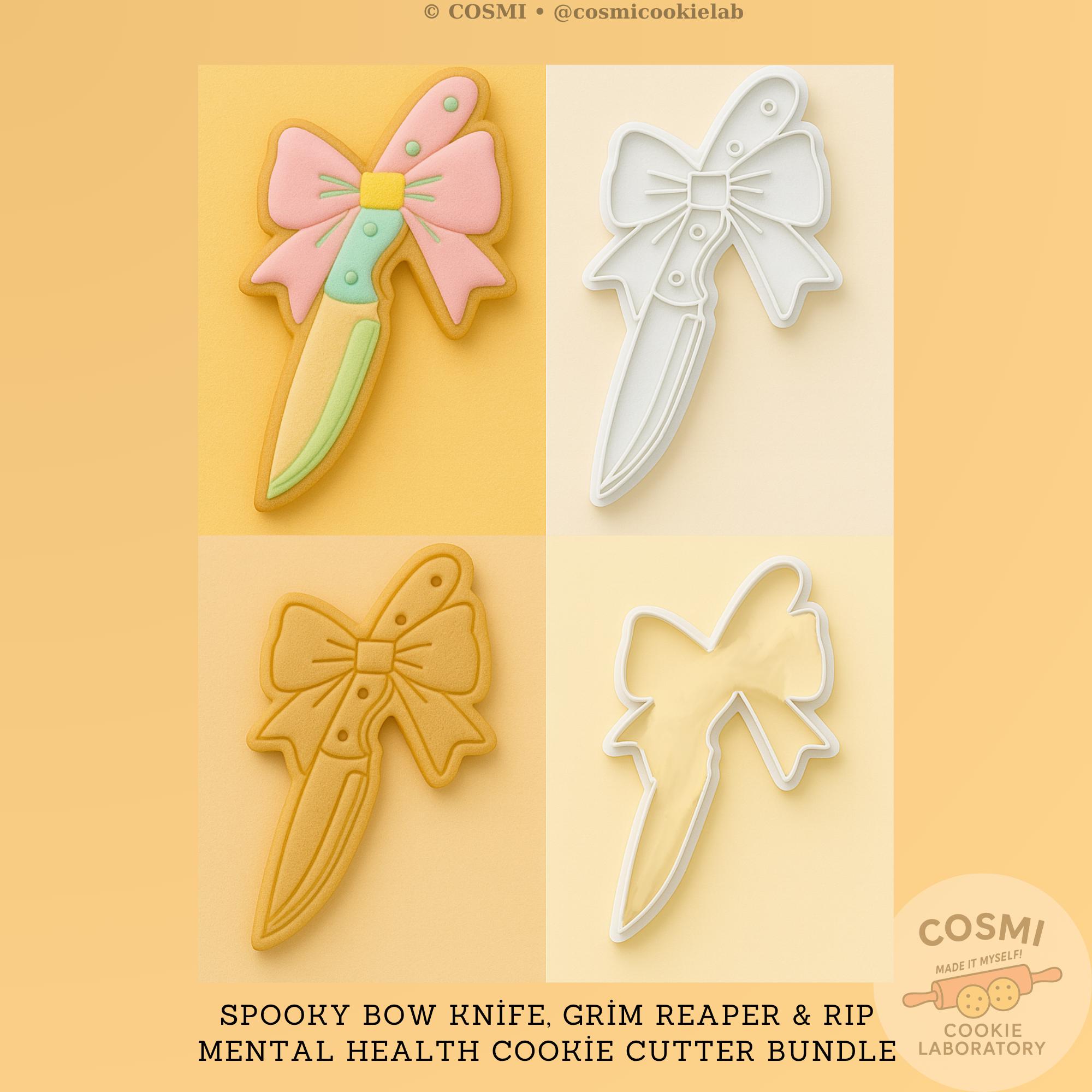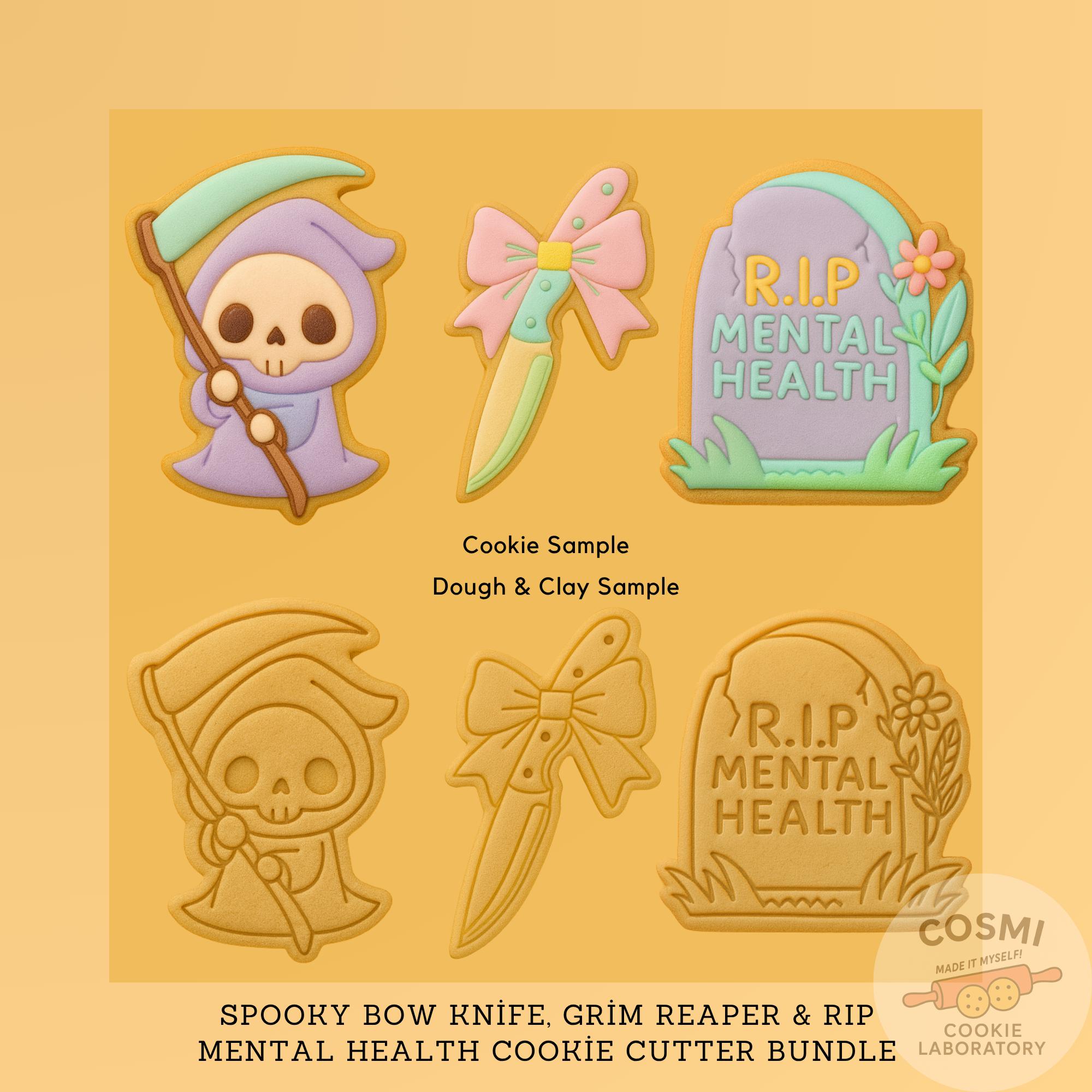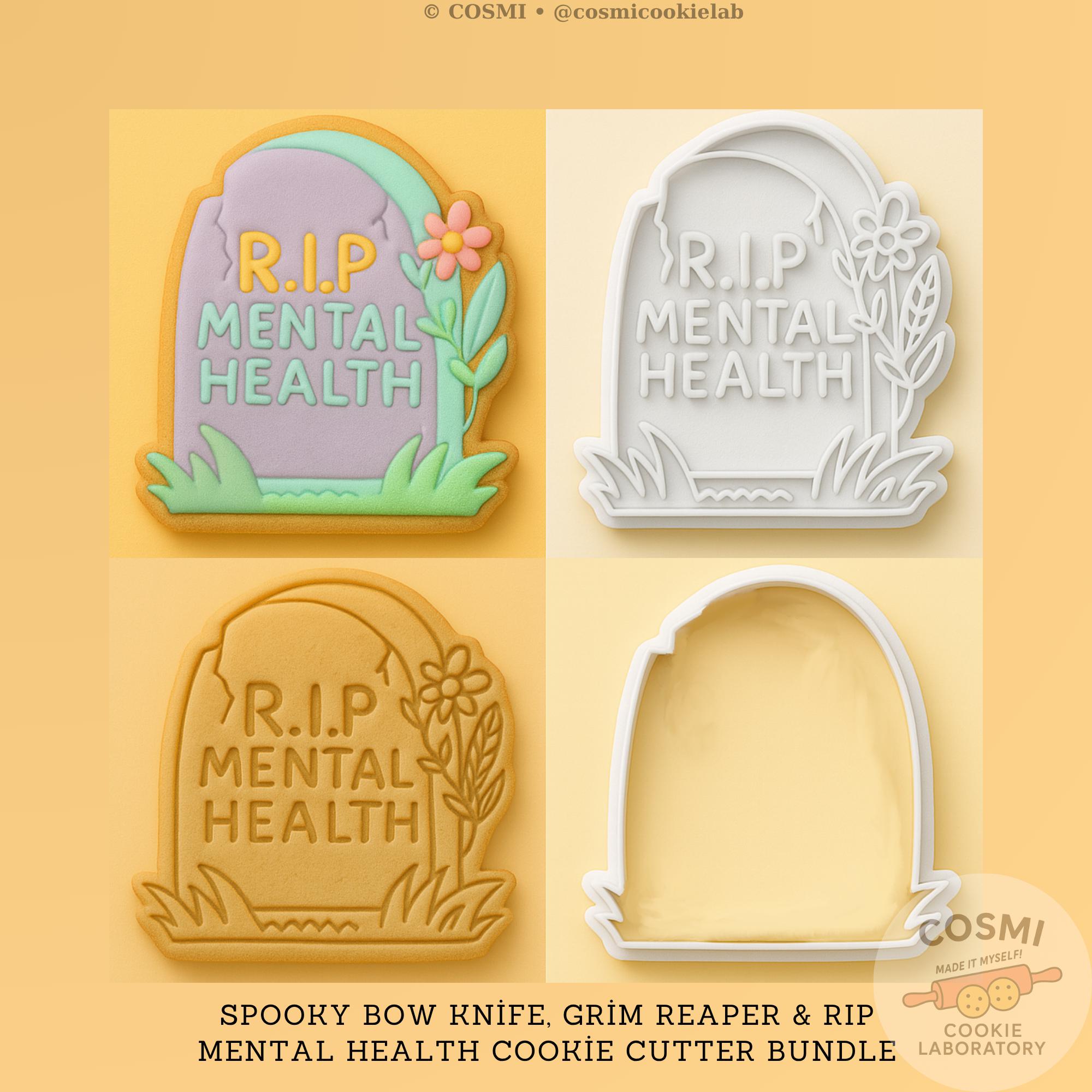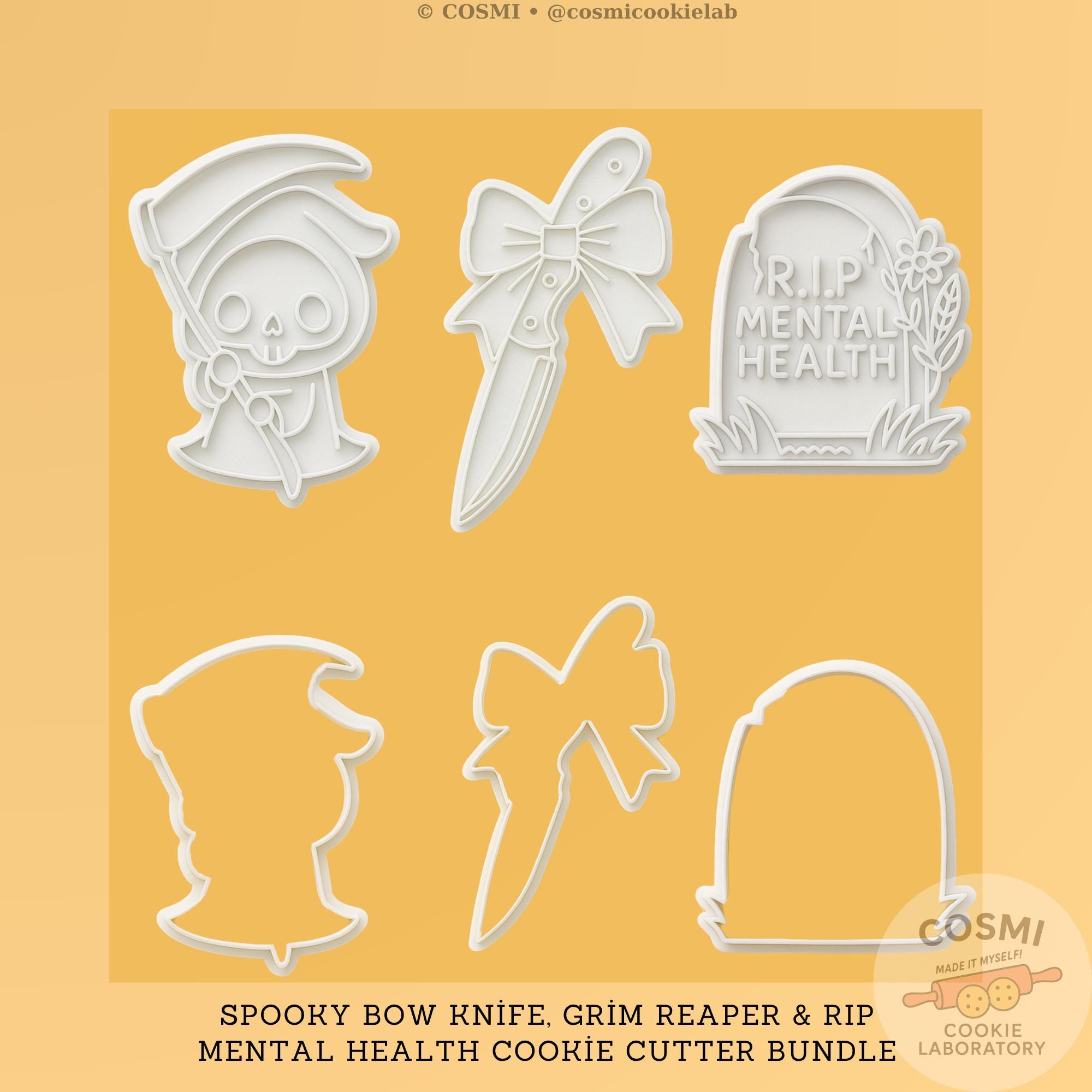 âď¸ Includes a ribbonâtied blade silhouette, a cute cartoon grim reaper, and an âRIP Mental Healthâ tombstone embosser for hauntingly detailed cookies.