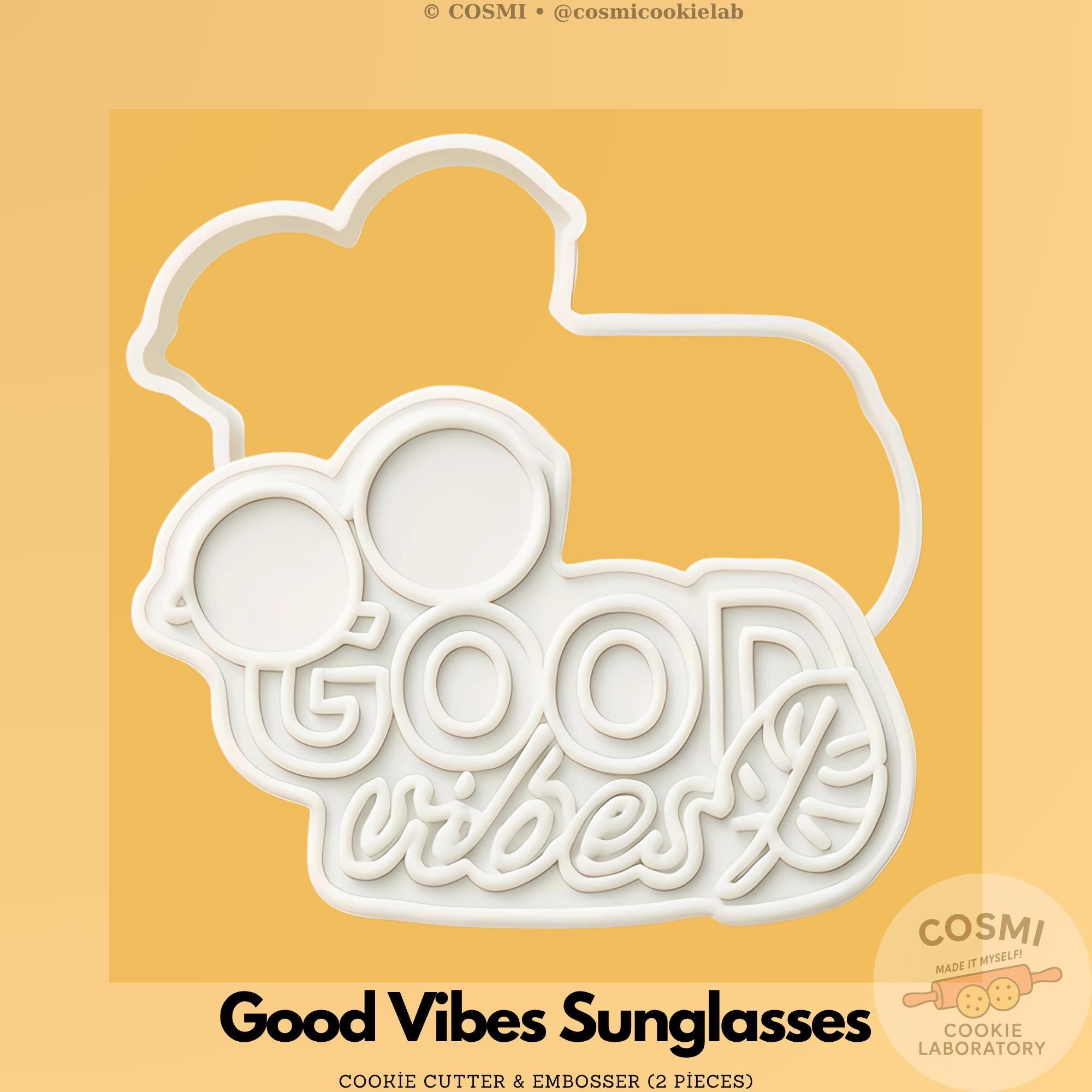 Add positivity to your cookie sets with this Good Vibes Cookie Cutter & Embosser, featuring bold lettering, a leaf accent, and round sunglasses for a fun, cheerful design. Perfect for summer parties, beach themes, festival sets, motivational cookie boxes, and everyday bakery collections.