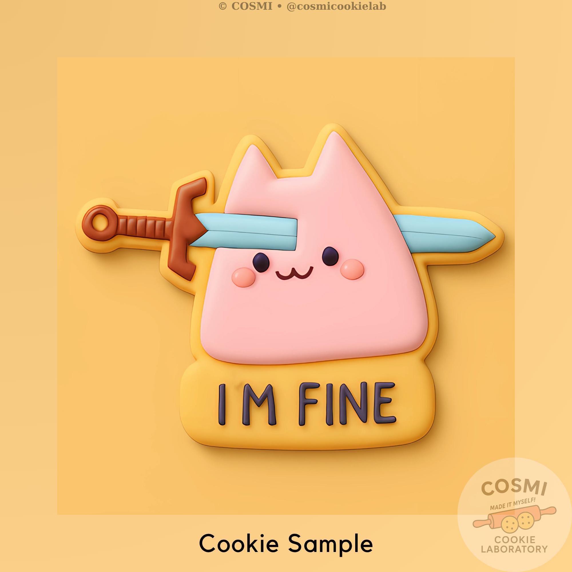 Bake fun and expressive cookies with this I’m Fine Cat Cookie Cutter & Embosser, featuring a chubby cat with a sword and the phrase “I’m Fine.” Perfect for meme cookie sets, gamer themes, birthday boxes, party favors, and novelty gift collections.