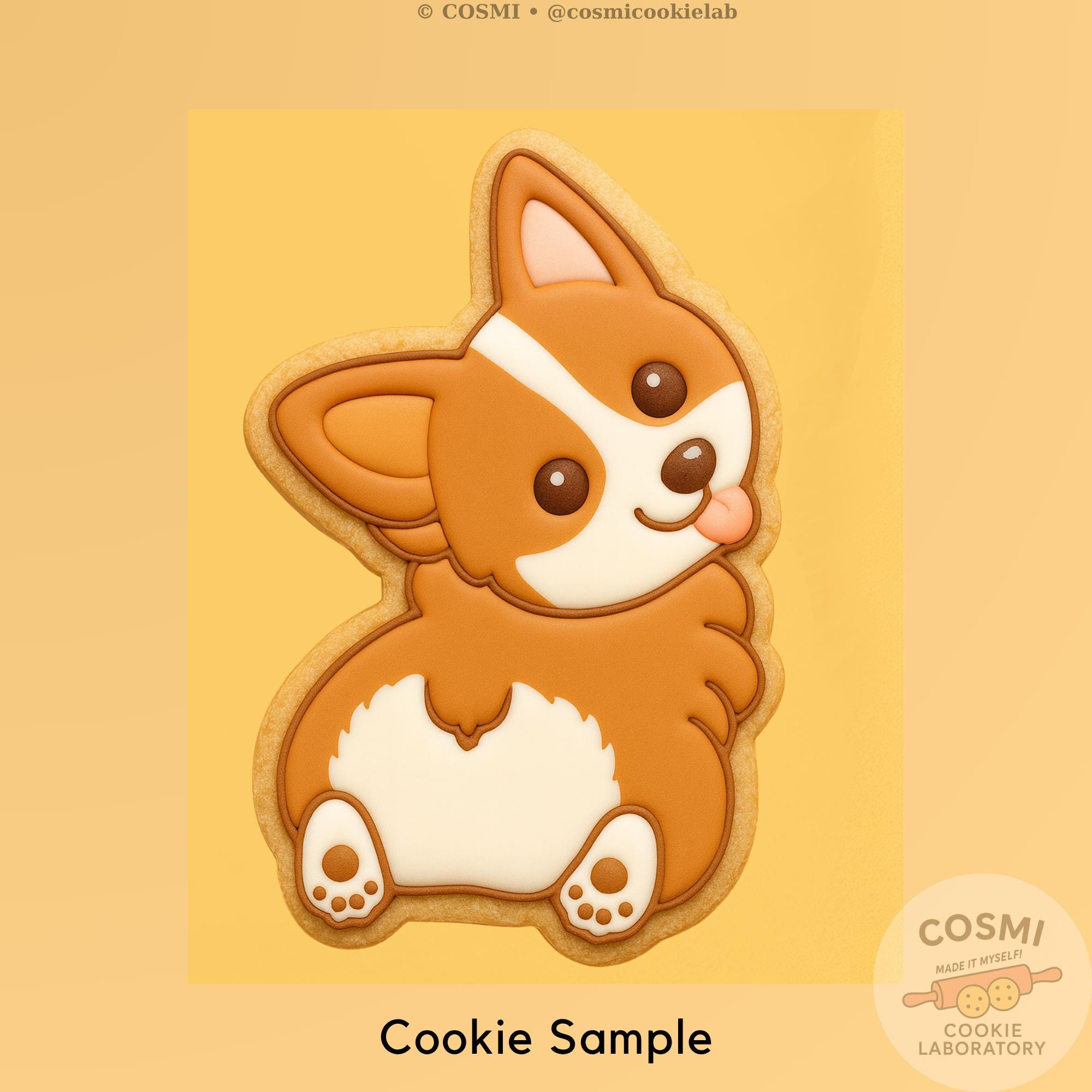 • Features a smiling corgi with detailed paws, fluffy tail, and playful tongue