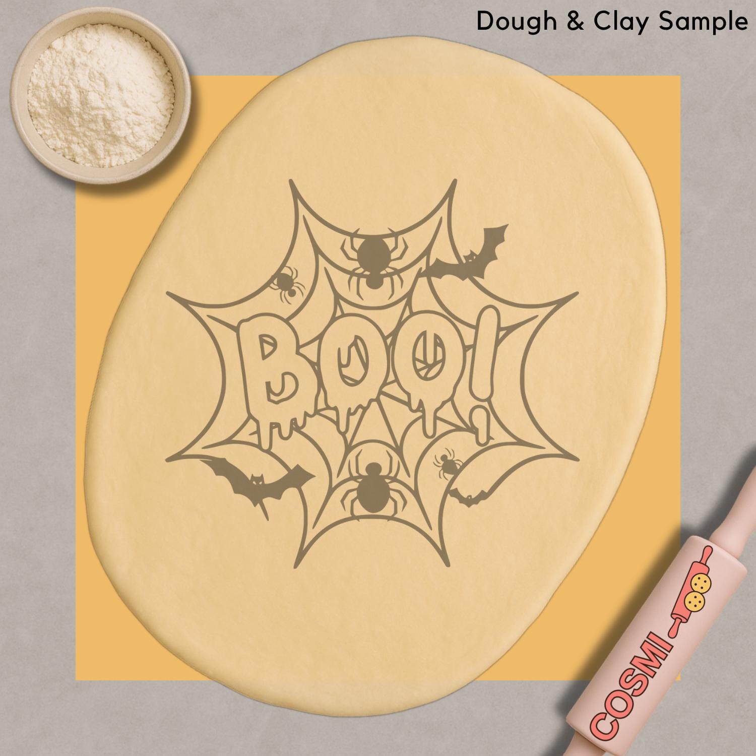 Featuring dripping “BOO” letters, creepy spiders, and flying bats, this design is perfect for making Halloween cookies, fondant toppers, or clay crafts with extra eerie detail.