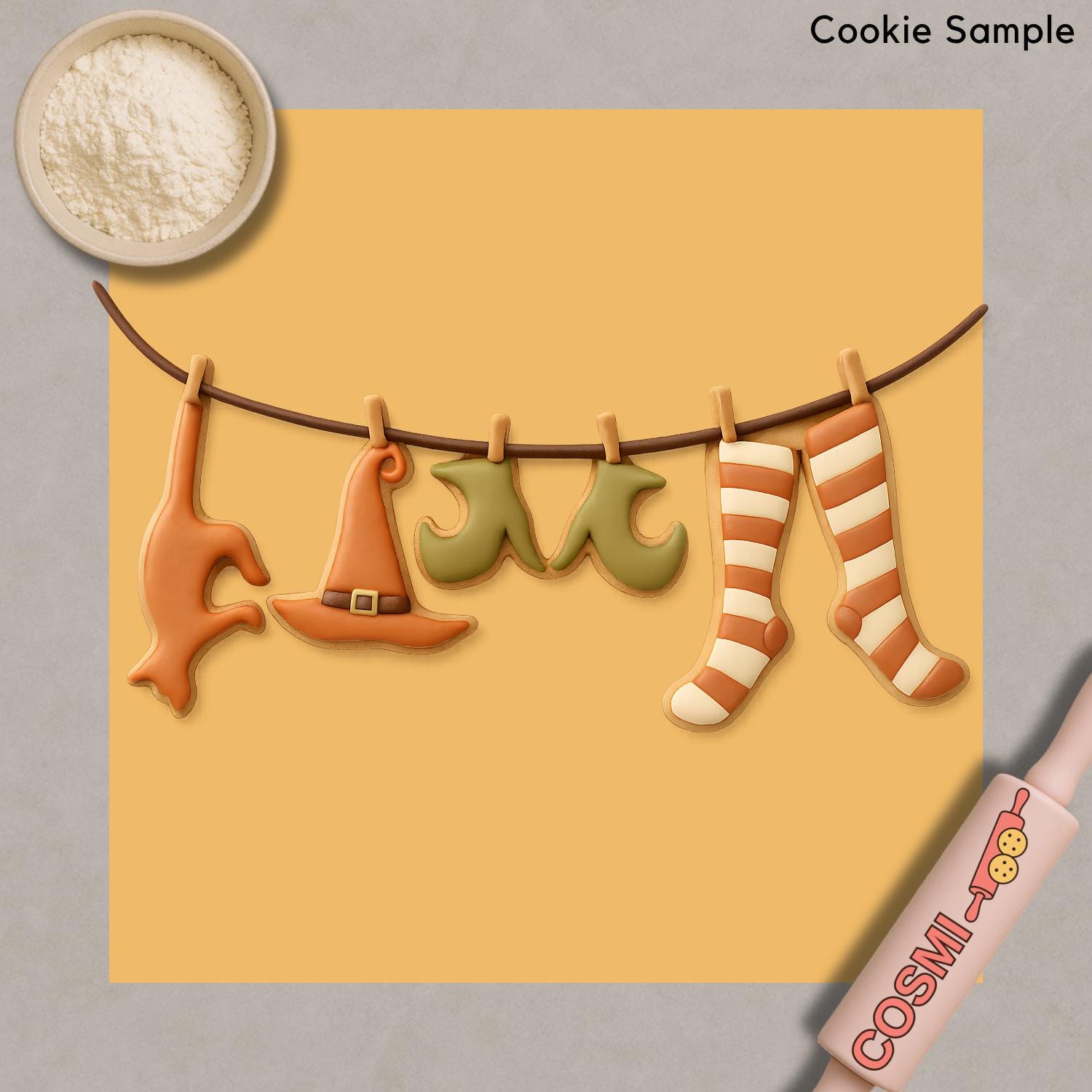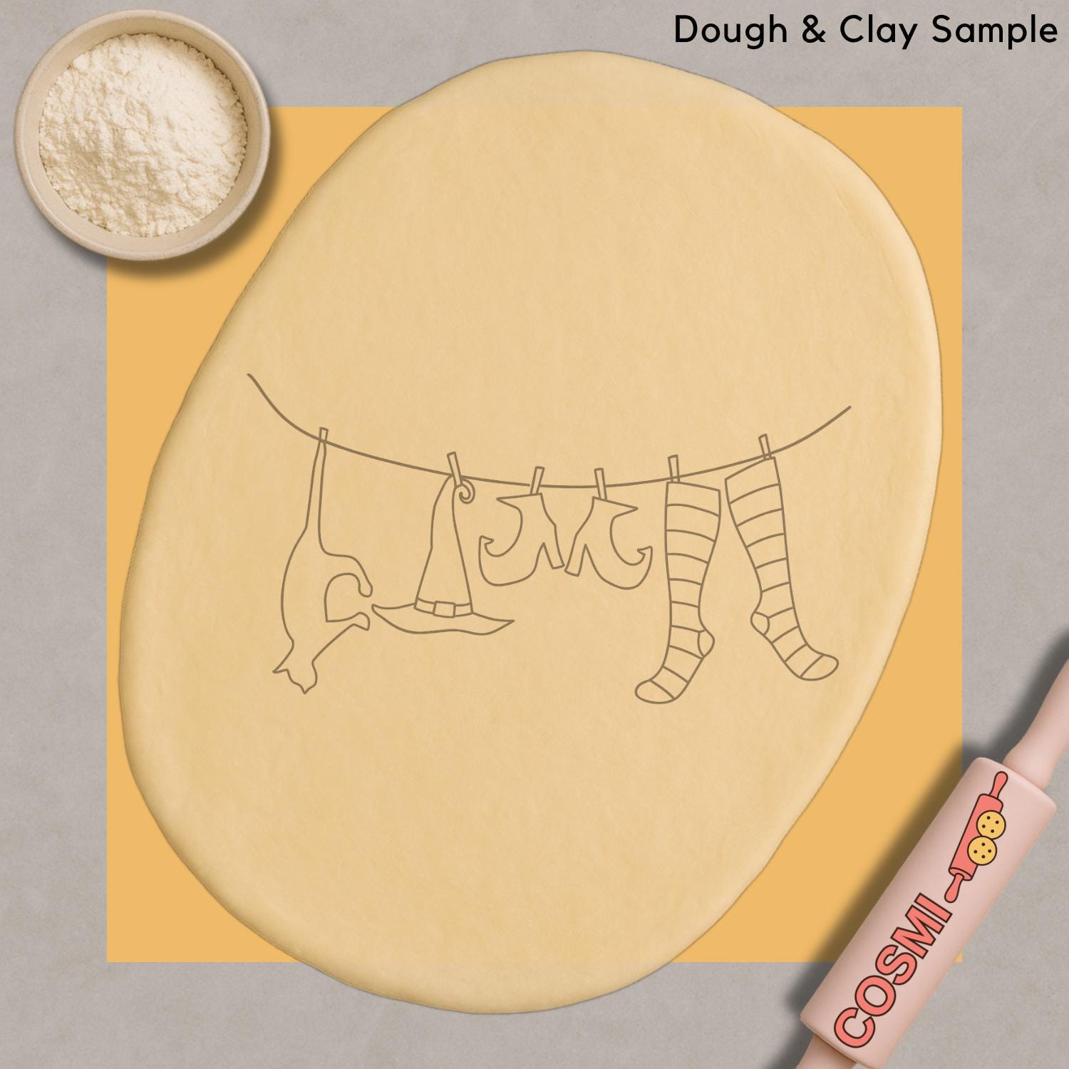 Featuring a witch’s hat, boots, and striped stockings hanging on a clothesline, this playful design is perfect for themed cookies, fondant toppers, or clay crafts. A fun addition to bake sales, party tables, or witch-themed events.
