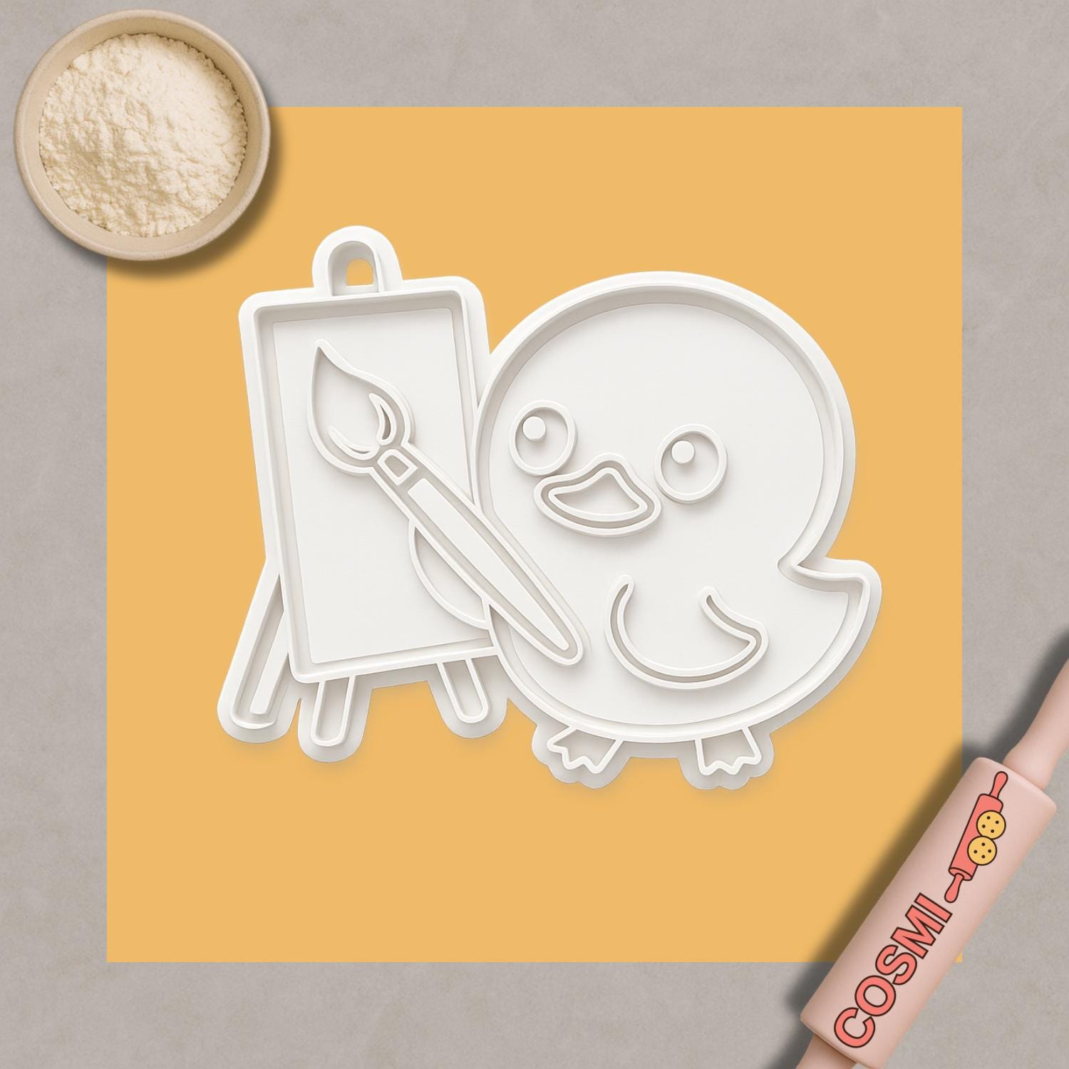 Decorate adorable cookies with this Duck Painting Cookie Cutter & Embosser, featuring a little duck holding a brush and painting on a canvas. Perfect for art-themed parties, painter sets, birthday boxes, school events, and creative gift collections.