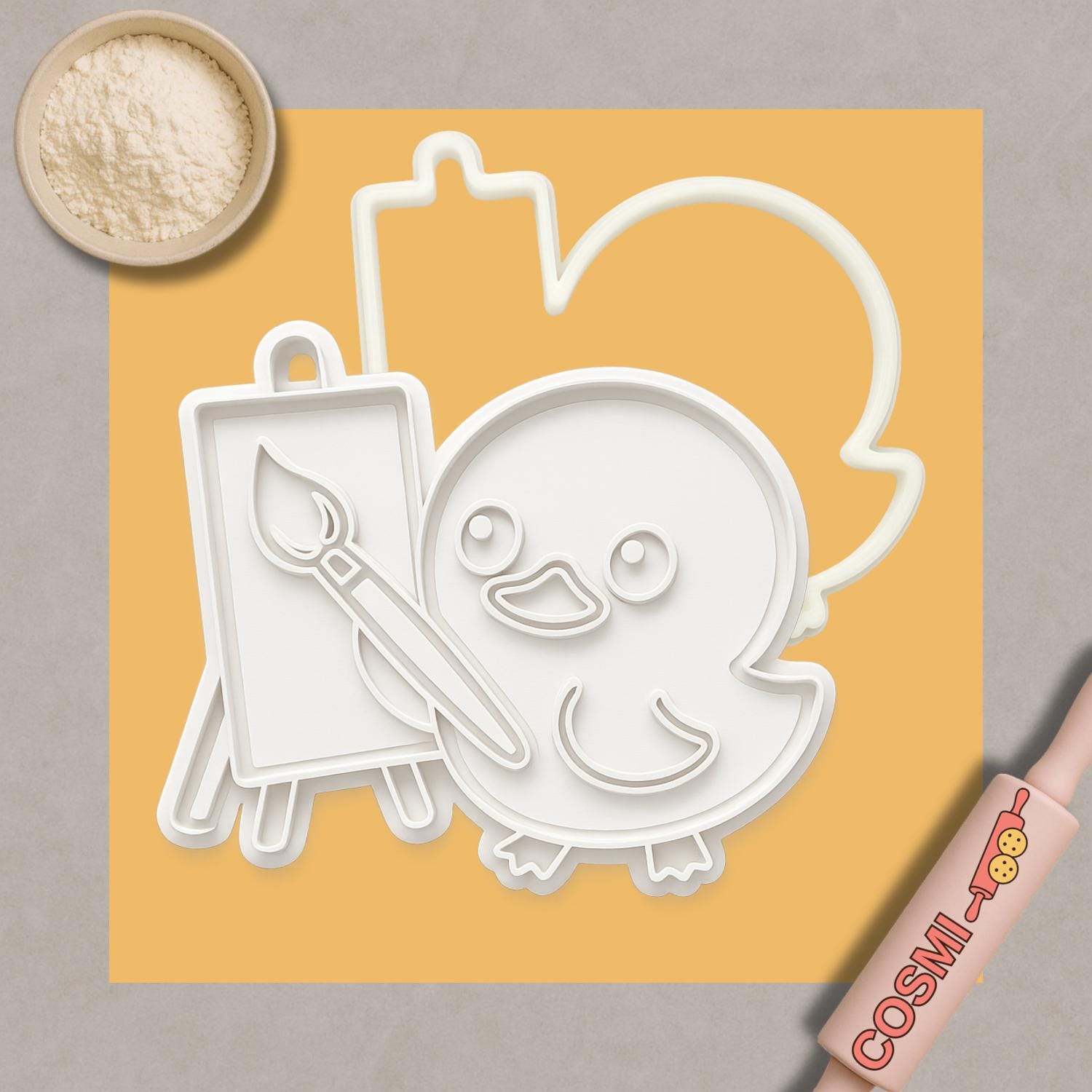 The cutter outlines the full duck and easel shape, while the embosser adds facial features, brush lines, and canvas details. Compatible with cookie dough, fondant, and clay.