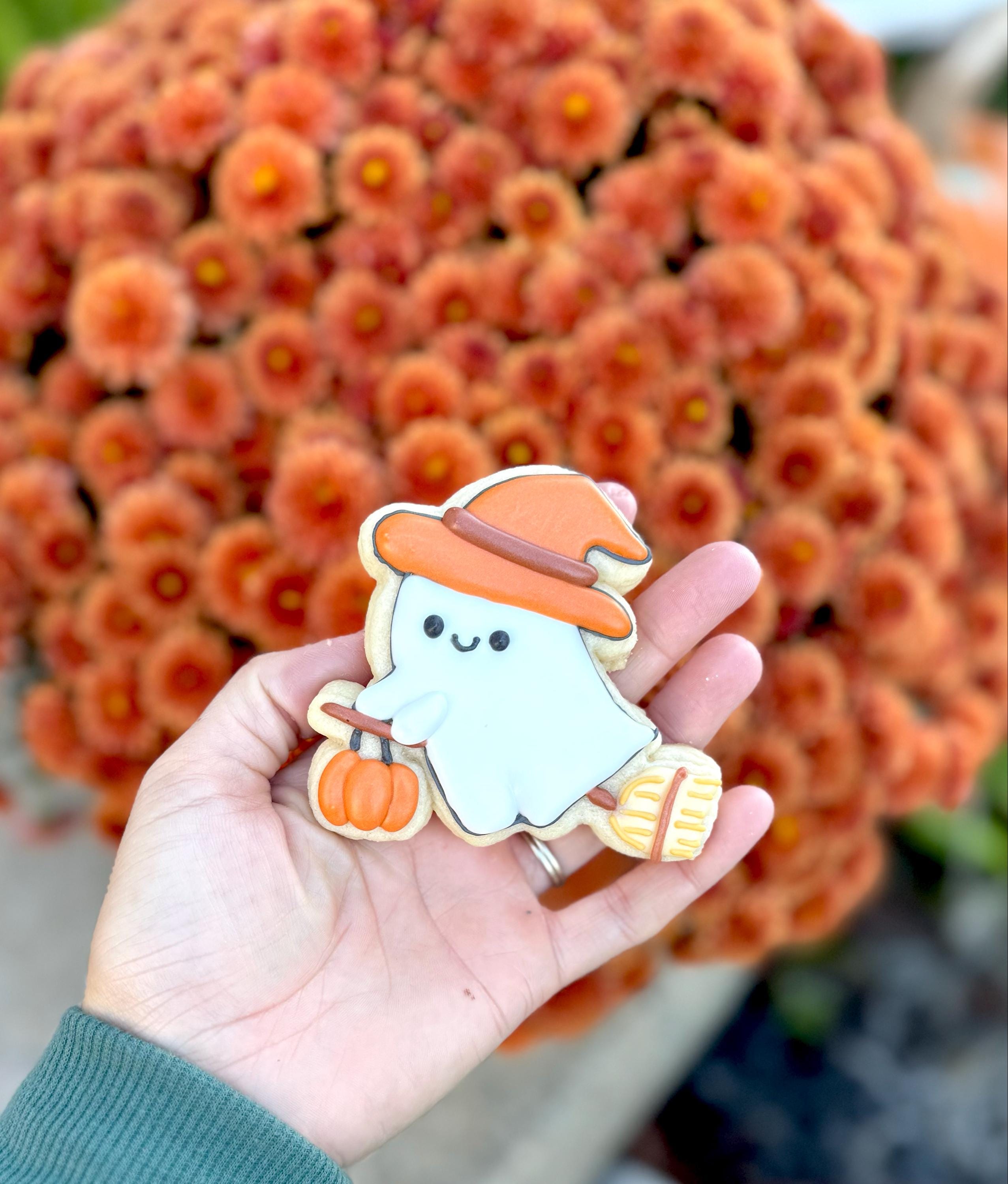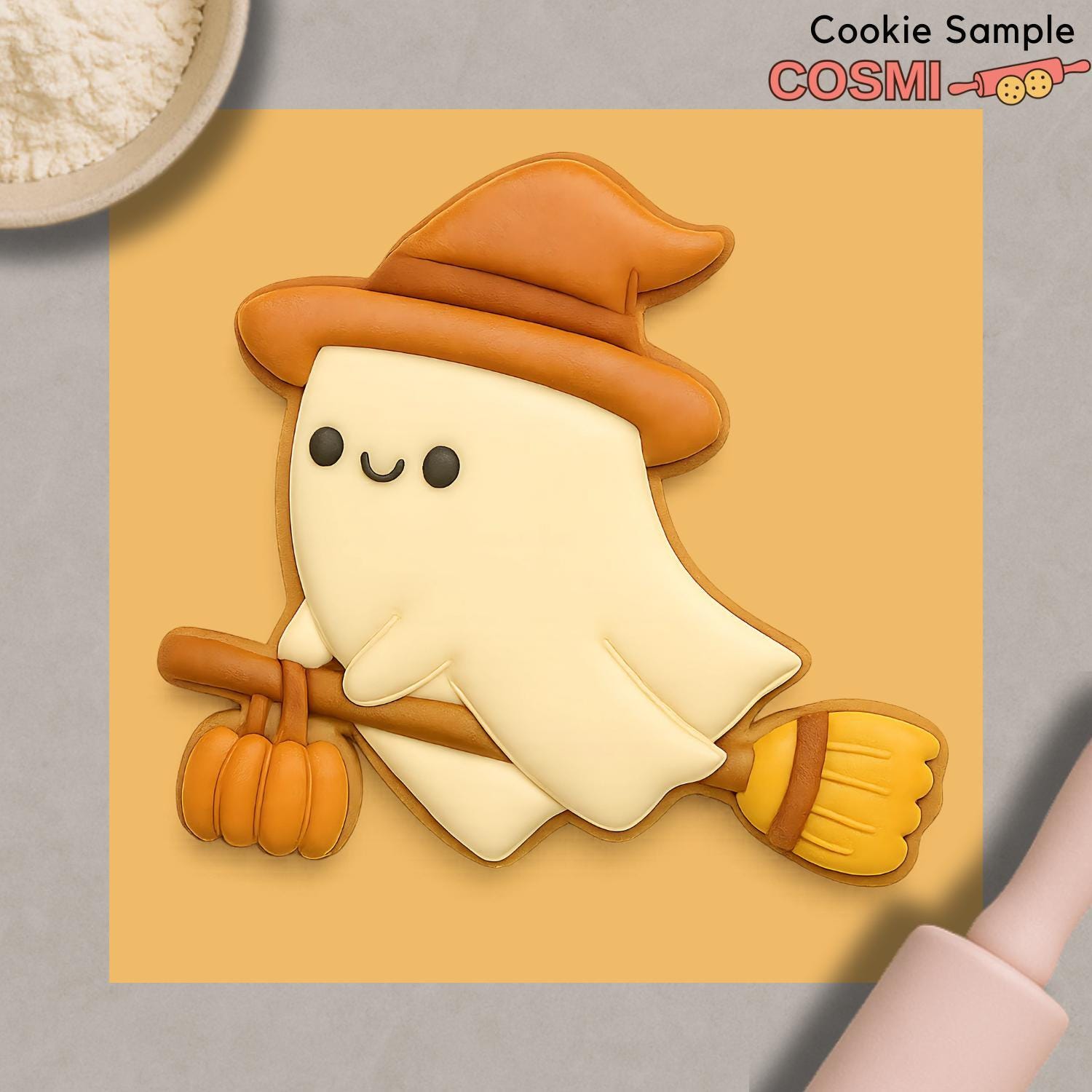 Add a whimsical touch to your Halloween baking with our Witch Ghost cookie cutter and fondant embosser. Featuring an adorable ghost wearing a witch hat, flying on a broomstick, and carrying a pumpkin, this design is perfect for spooky yet cute cookies, fondant creations, and craft projects. A fun choice for Halloween parties, themed dessert tables, and seasonal baking adventures.