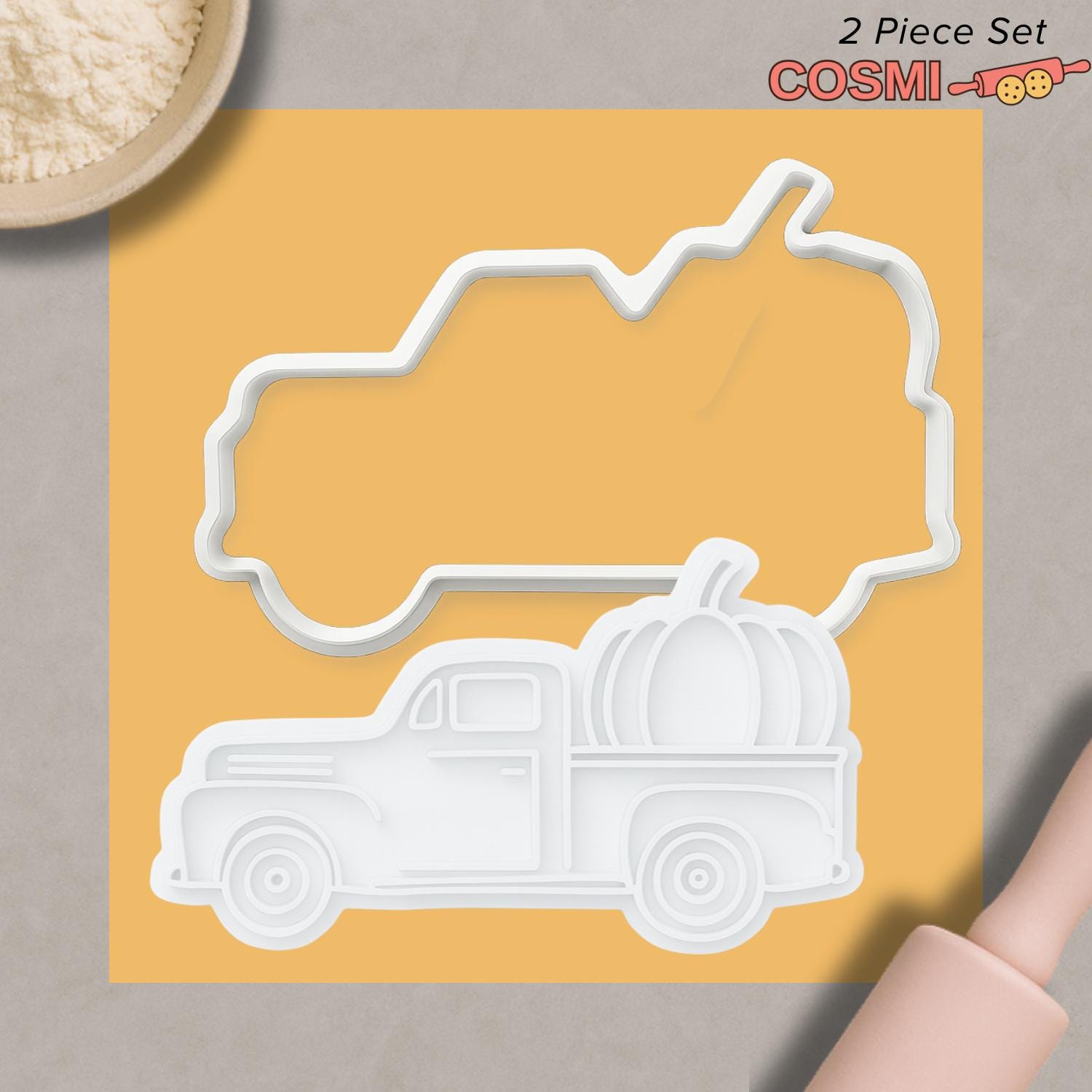 Bring a rustic harvest touch to your baking with our Pumpkin Truck cookie cutter and fondant embosser. Featuring a vintage farm truck carrying a plump pumpkin, this cozy design is perfect for autumn celebrations, Thanksgiving gatherings, or farmhouse-themed parties. Ideal for cookies, fondant decorations, and seasonal craft projects, it’s a must-have for fall baking fun.