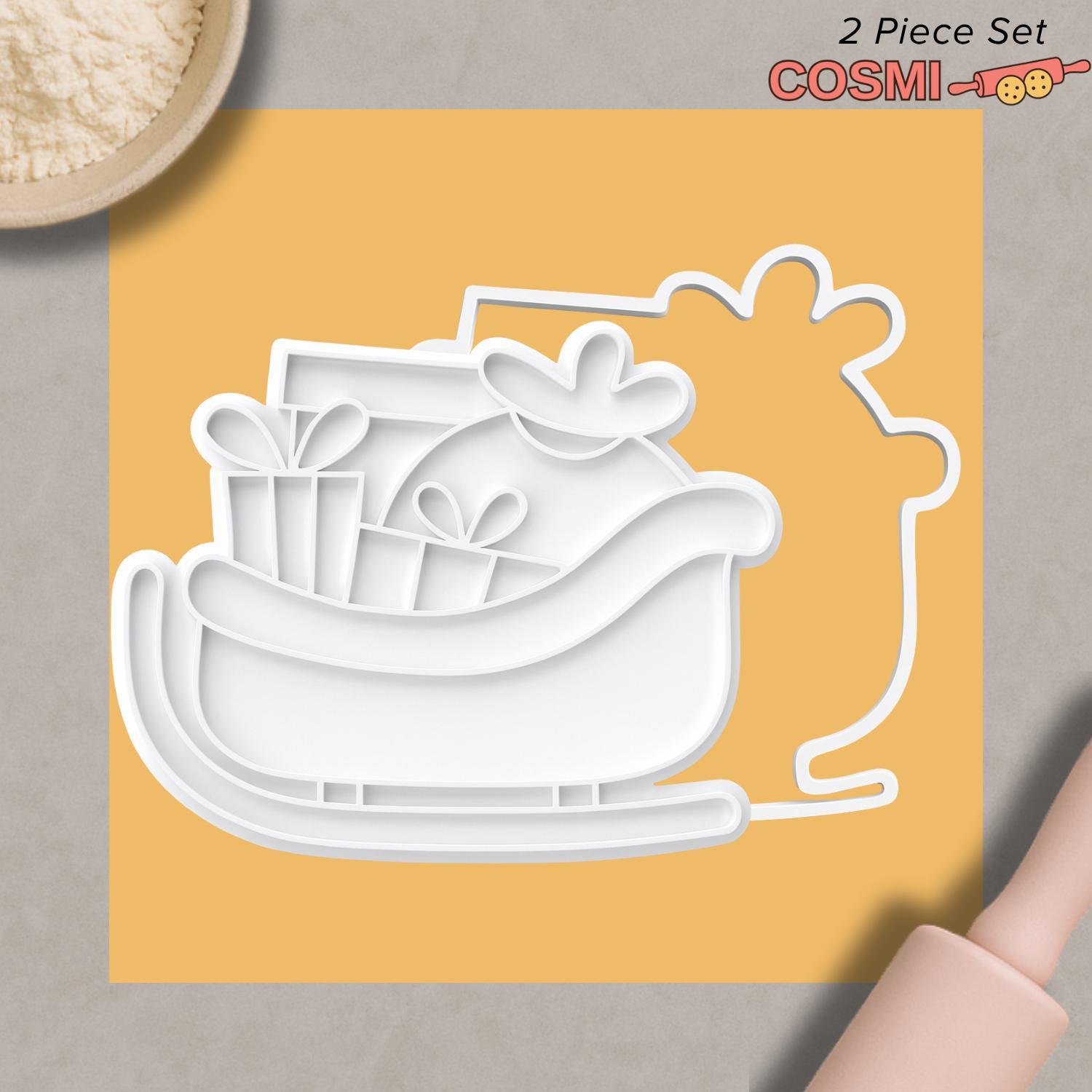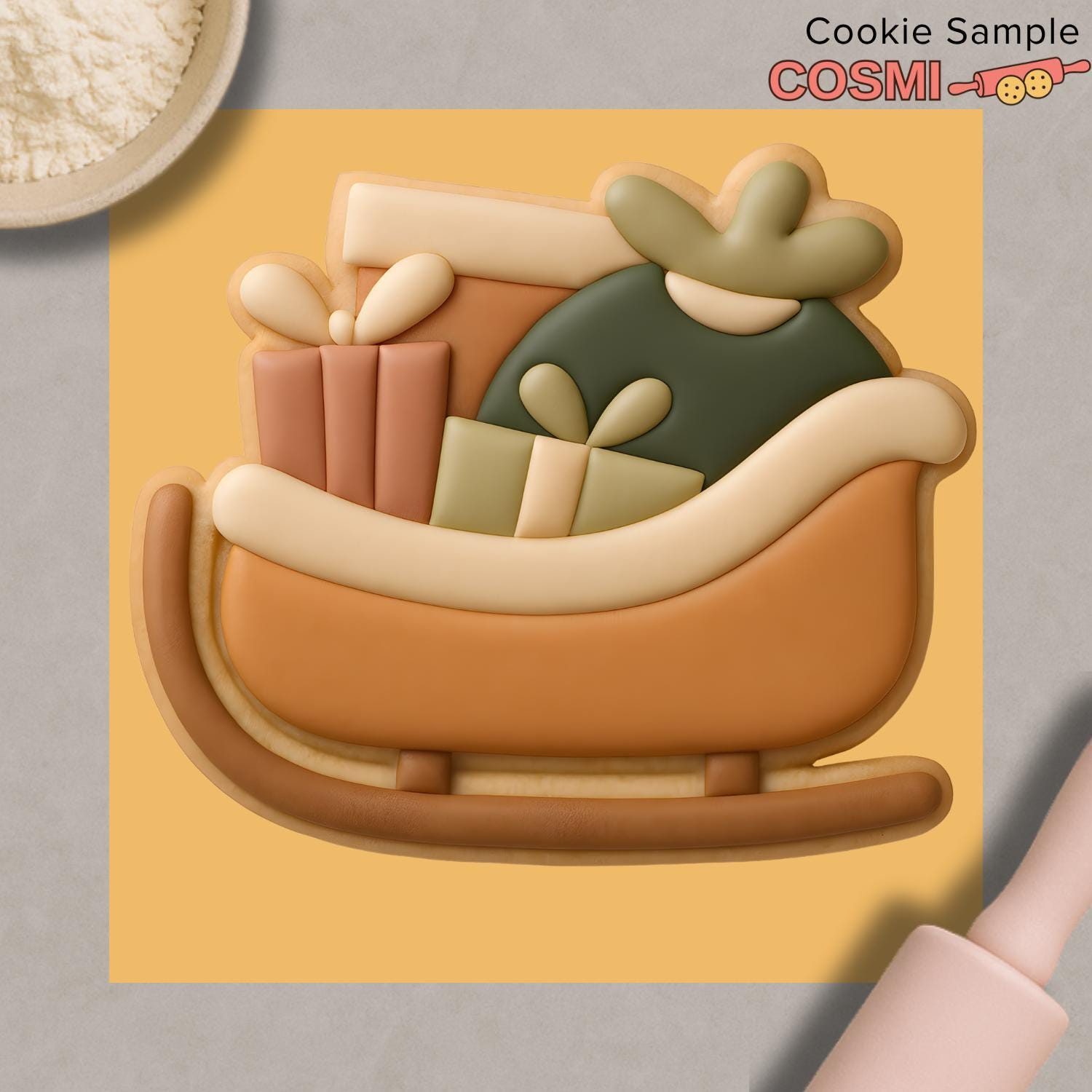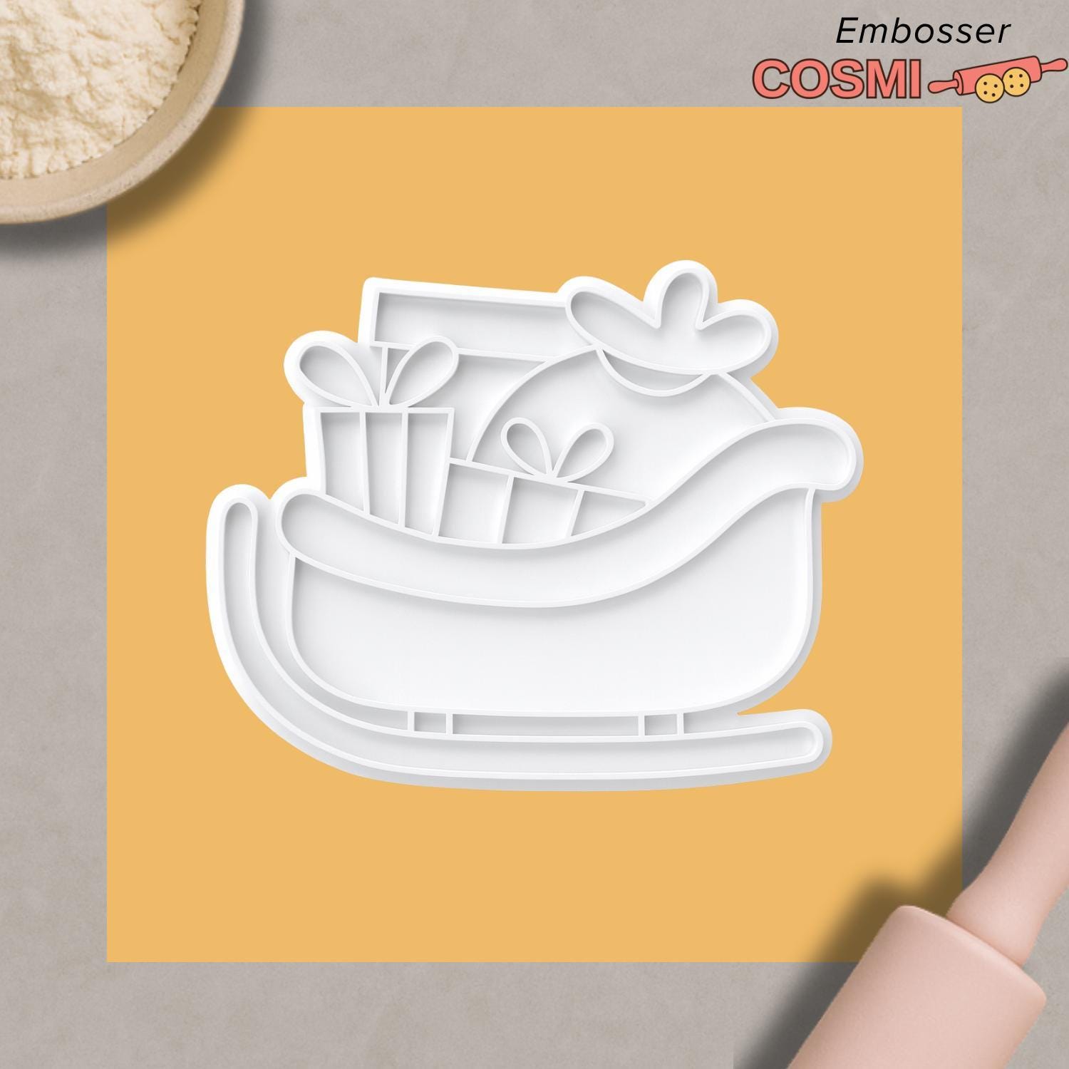 Create beautiful seasonal cookies with this Sleigh Cookie Cutter & Embosser, featuring a Christmas sleigh filled with gift boxes and a toy sack. Perfect for holiday baking, Christmas market sets, gift boxes, and winter cookie collections.