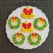 Design: Classic wreath with holiday elements like bells, candy canes, and stars