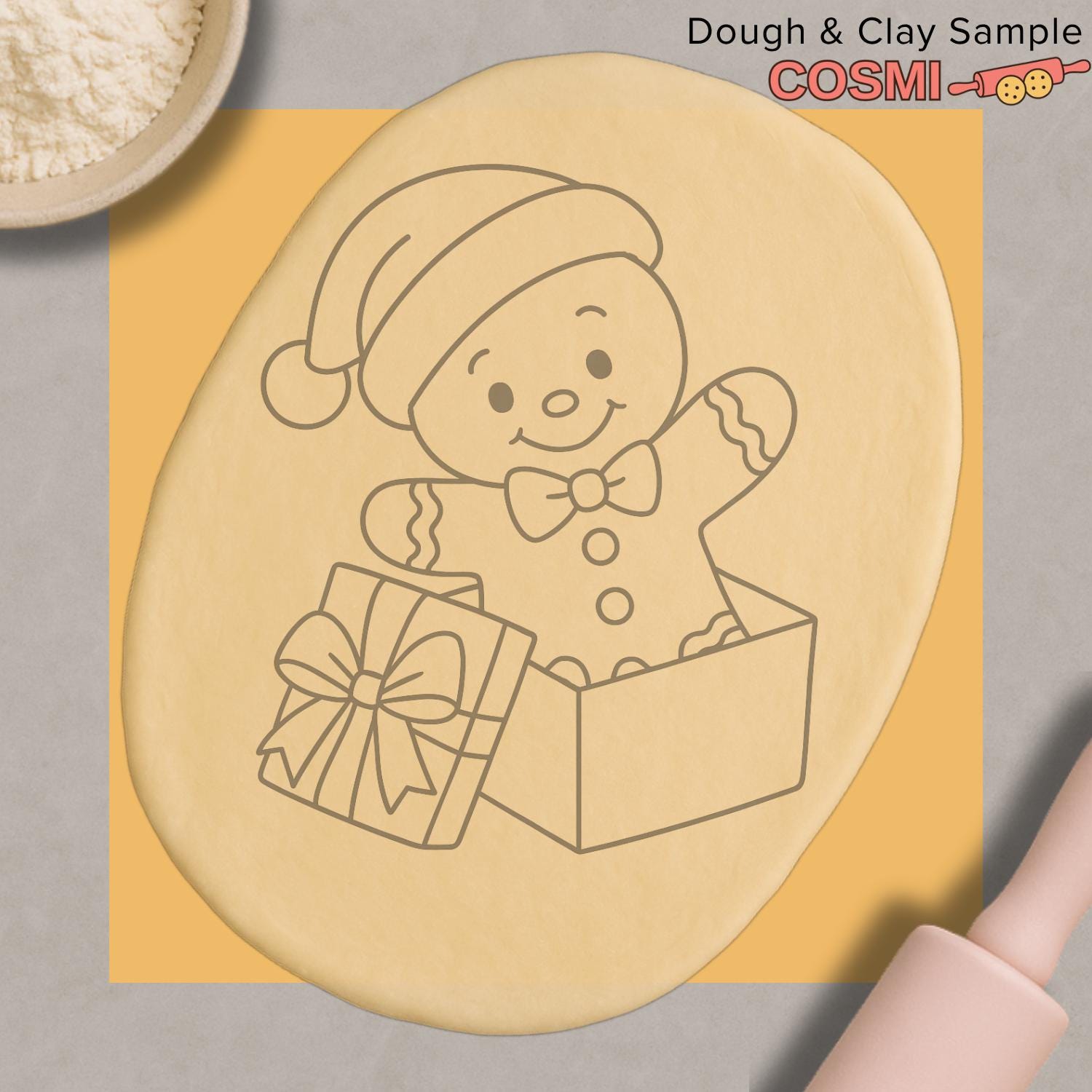 Design: Gingerbread boy inside a gift box with Santa hat and bow details