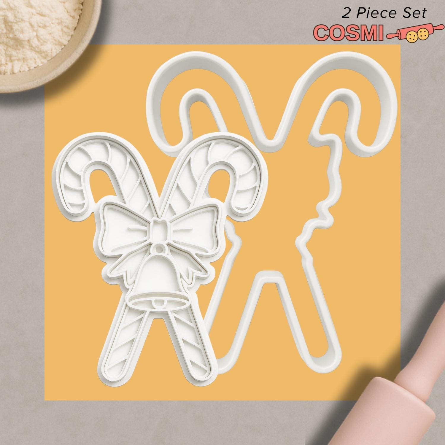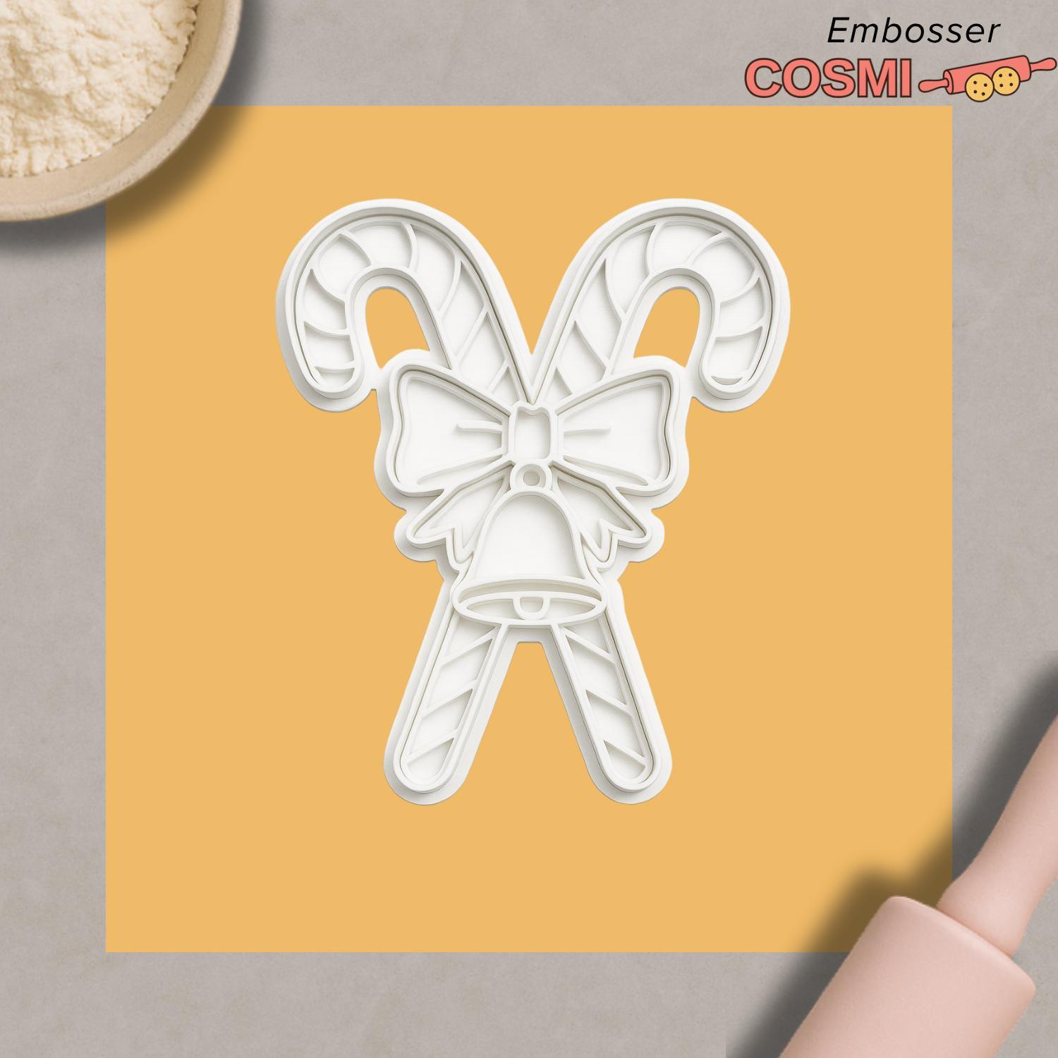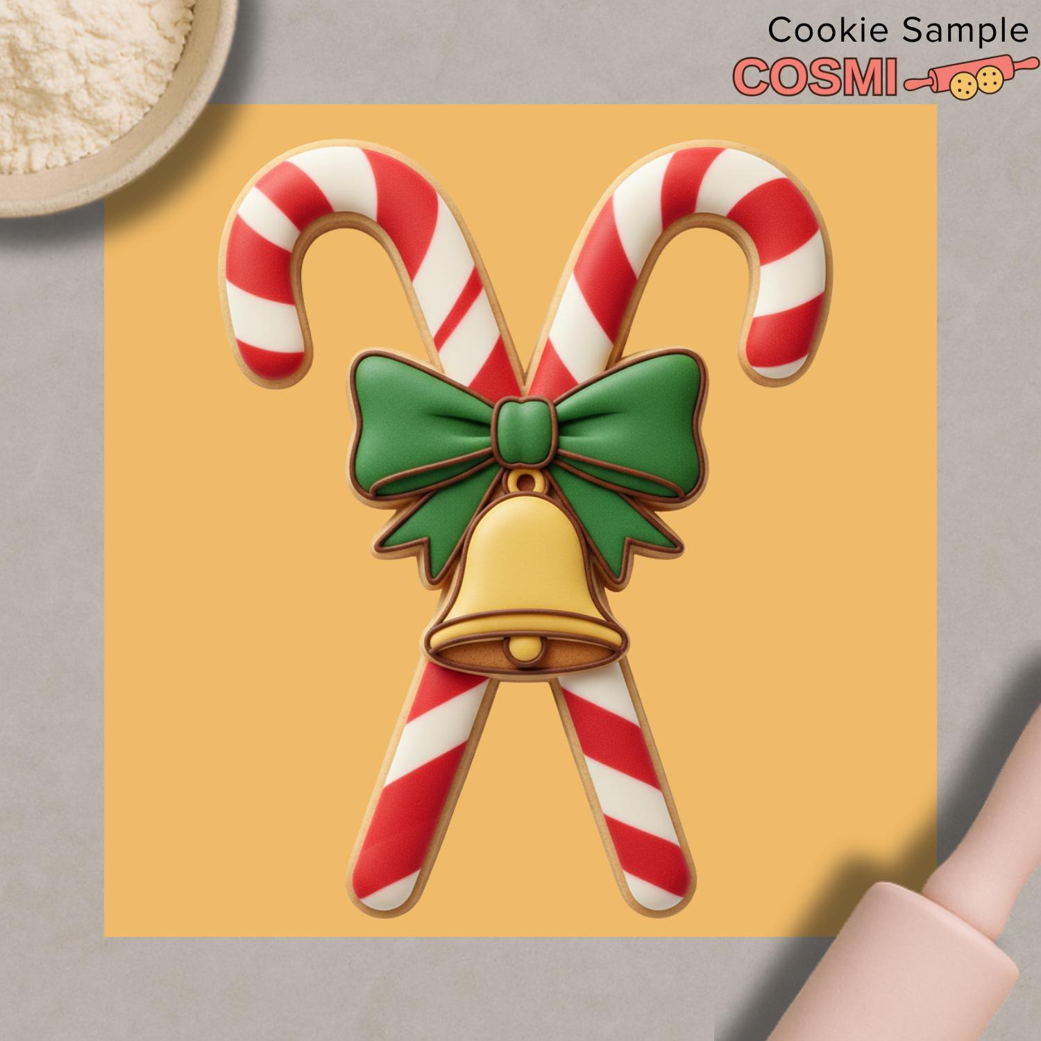Create detailed festive cookies with this Candy Cane Cookie Cutter & Embosser, featuring two crossed candy canes, a bow, and a Christmas bell. This design is perfect for holiday baking, gift boxes, seasonal markets, and Christmas cookie sets.