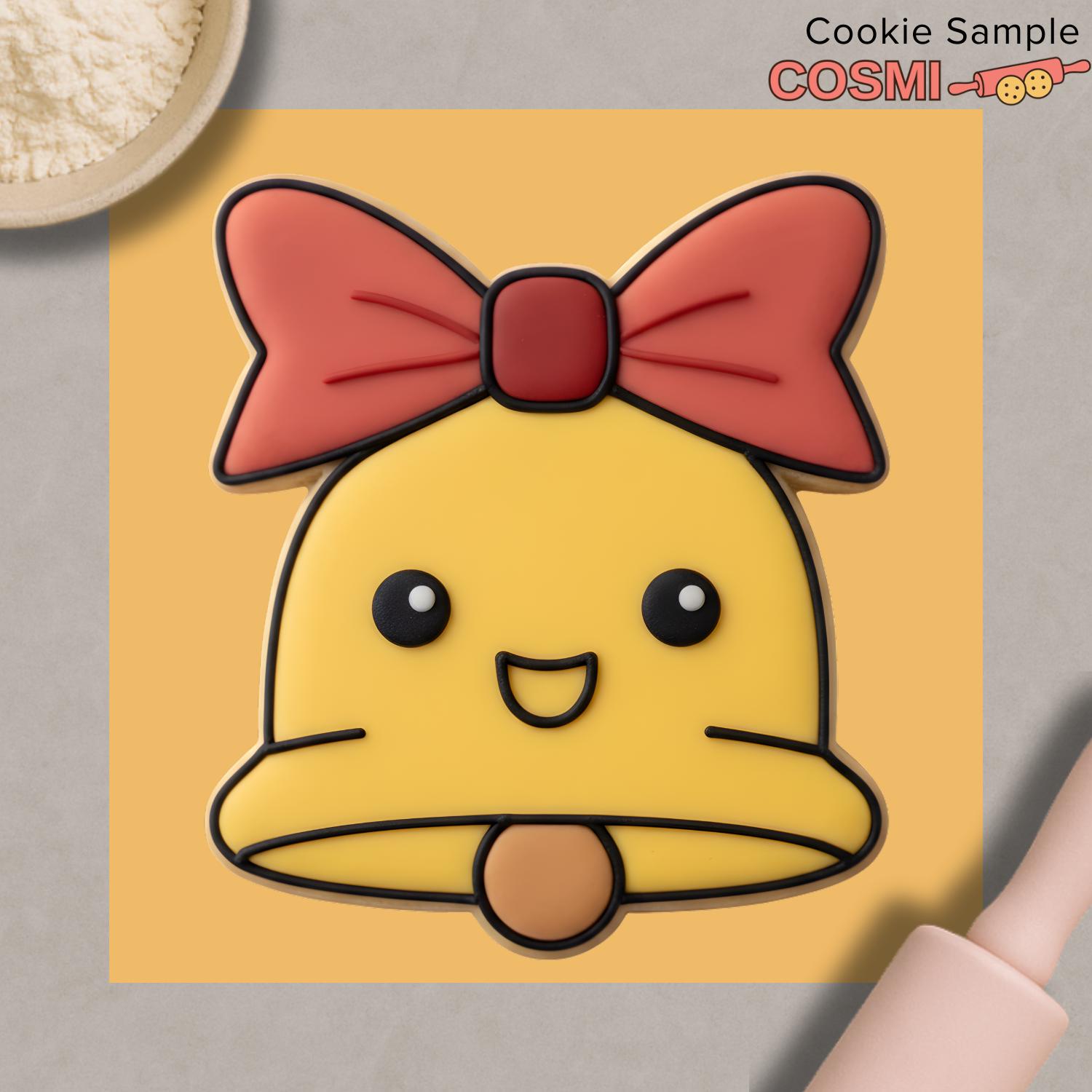 Create detailed festive cookies with this Bell Cookie Cutter & Embosser, featuring a holiday bell design with a bow and a smiling face. Perfect for Christmas cookie sets, gift boxes, winter baking projects, and seasonal market collections.