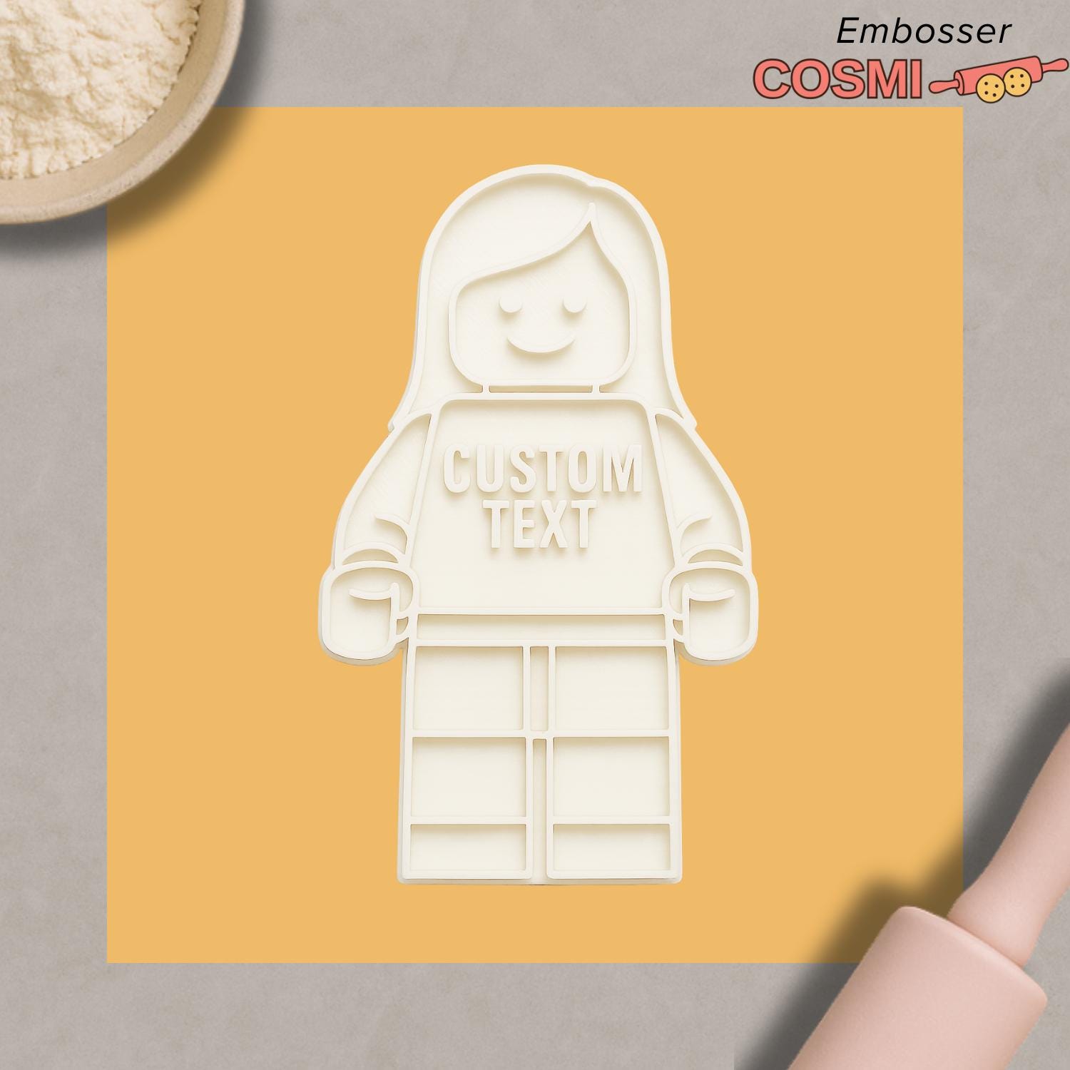 Create personalized cookies with this Custom Girl Figure Cookie Cutter & Embosser, designed in a toy-style character shape with customizable text on the shirt. Ideal for birthday cookies, party favors, themed sets, and personalized gift boxes. The cutter creates the full figure silhouette, while the embosser adds facial details and clean custom lettering.